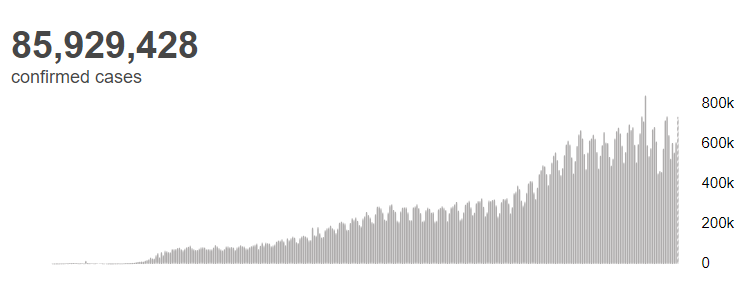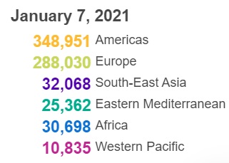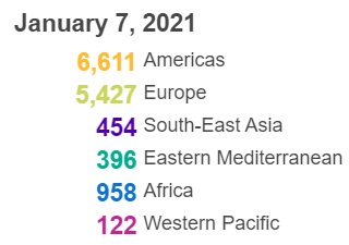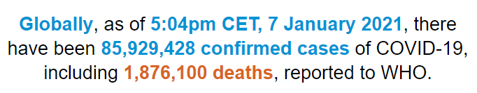 根据世卫组织最新实时统计数据,截至欧洲中部时间1月7日17时04分(北京时间1月8日0时04分),全球累计新冠肺炎确诊病例85929428例,累计死亡病例1876100例。7日全球新冠肺炎确诊病例新增735944例,死亡病例新增13968例。