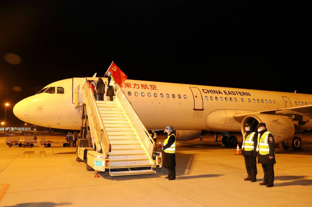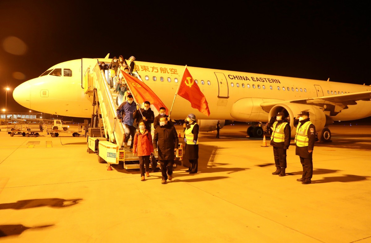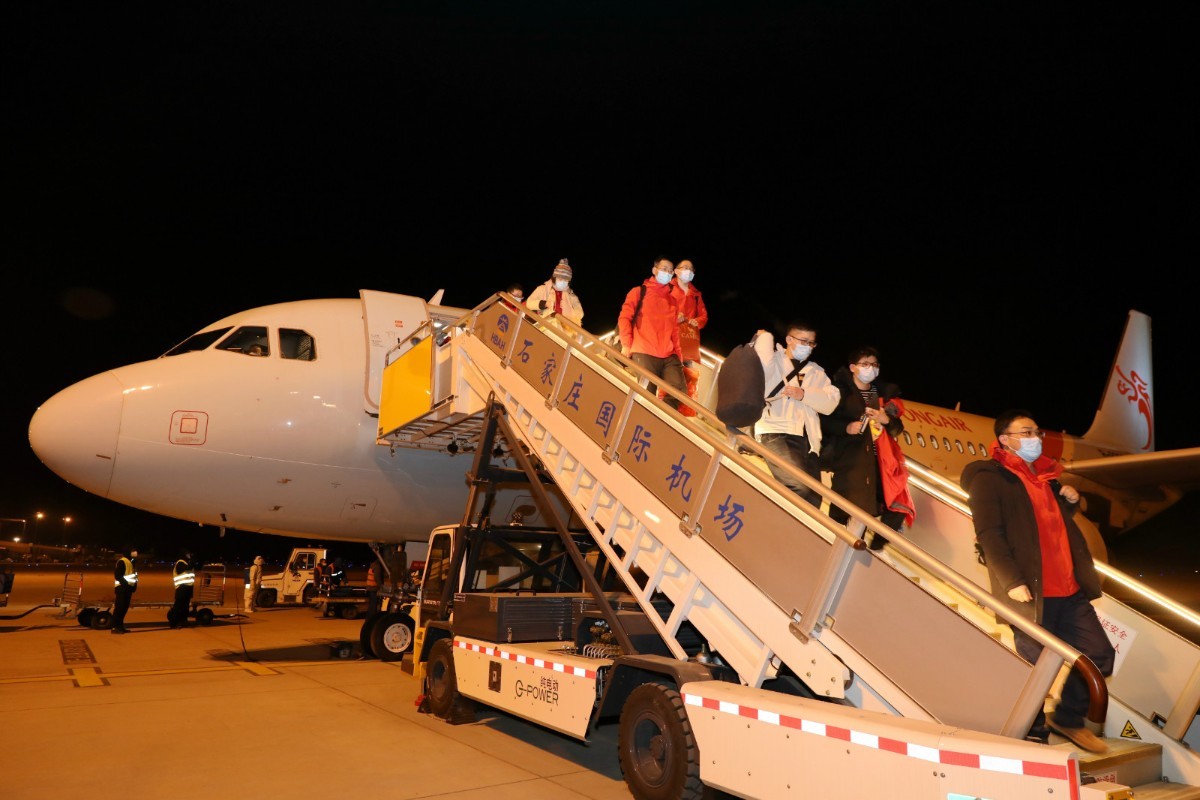 1月7日21时56分、22时37分,东方航空公司MU9003航班和长龙航空公司GJ6001航班先后降落石家庄机场,来自江苏省的106名检验医疗队员以及来自浙江省的103名核酸检测医疗队员冒着严寒驰援燕赵,协助石家庄市、邢台市开展核酸检测工作。