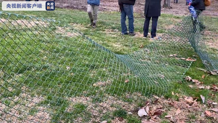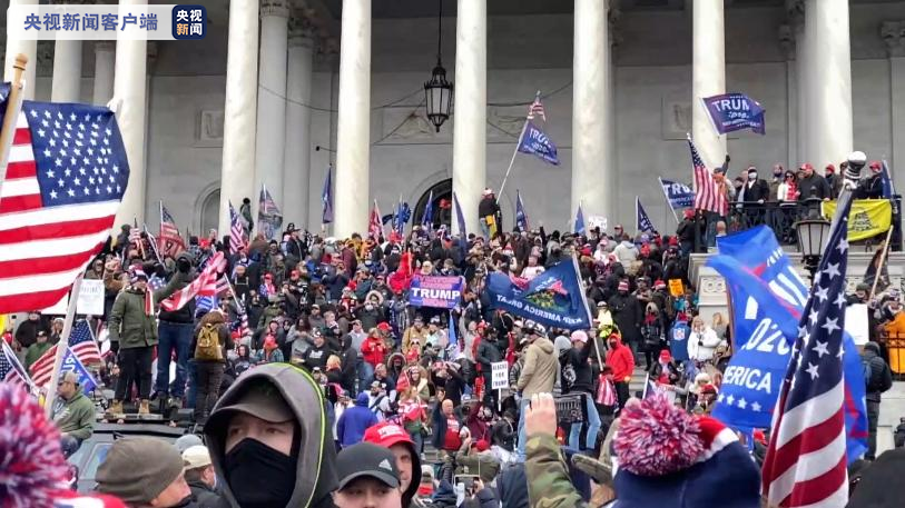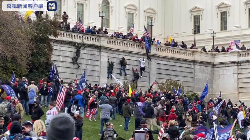 央视记者 刘旭:尽管国会山外设置了多道这样的围栏,但是有很多处的围栏都像这样,被特朗普的支持者冲毁或者破坏,而且在我身后国会山的高墙上,很多支持者还在攀爬高墙,试图登上国会山继续抗议。