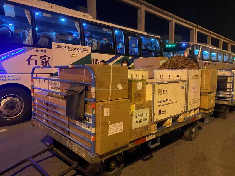 1月7日21时56分、22时37分,东方航空公司MU9003航班和长龙航空公司GJ6001航班先后降落石家庄机场,来自江苏省的106名检验医疗队员以及来自浙江省的103名核酸检测医疗队员冒着严寒驰援燕赵,协助石家庄市、邢台市开展核酸检测工作。