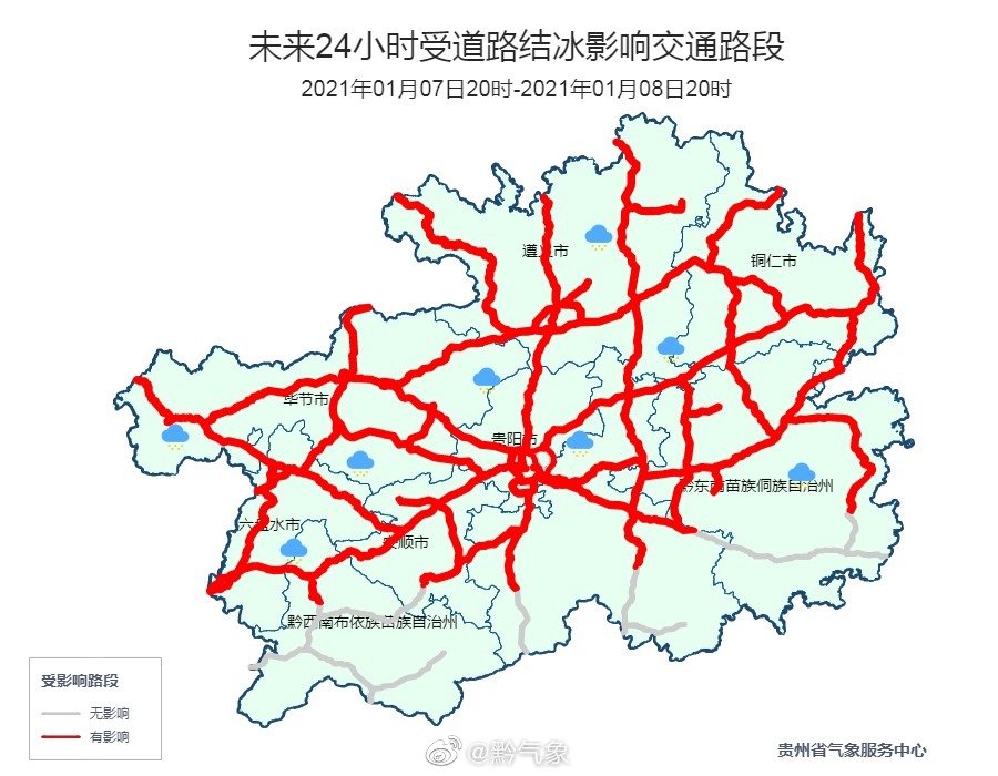 预计8日白天到夜间,贵州省道路结冰情况将有所缓和。其中贵州省的西部和北部地区阴天有零星冻雨或雨夹雪,东北部白天多云夜间阴天,其余地区阴天为主,中西部地势高处有道路结冰。