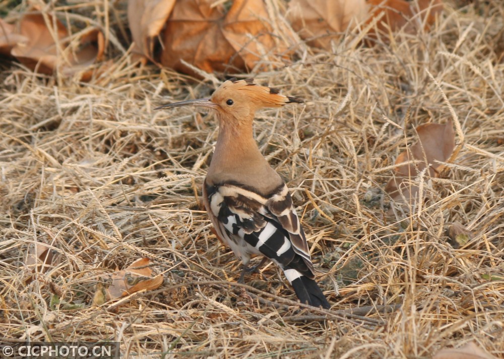 ↑河北省邢台市广宗县一公园,一只戴胜鸟在草丛中漫步。CICPHOTO/祝雪威 摄