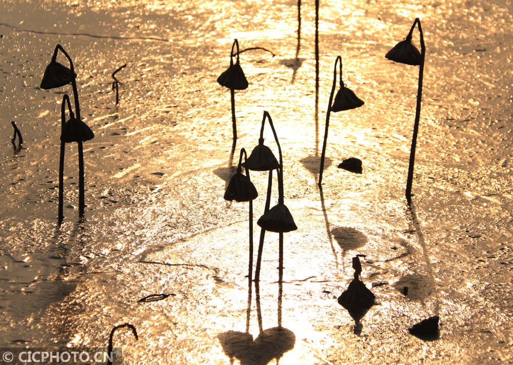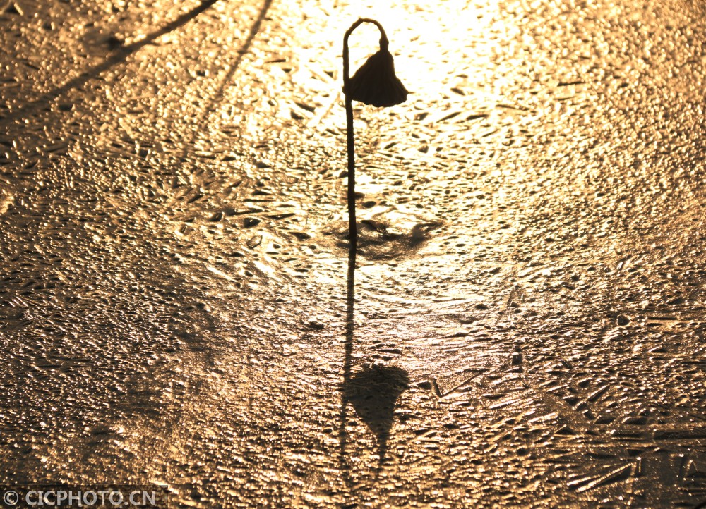 ↑在河北省邢台市广宗县一公园拍摄的冰面上的残荷。CICPHOTO/祝雪威 摄