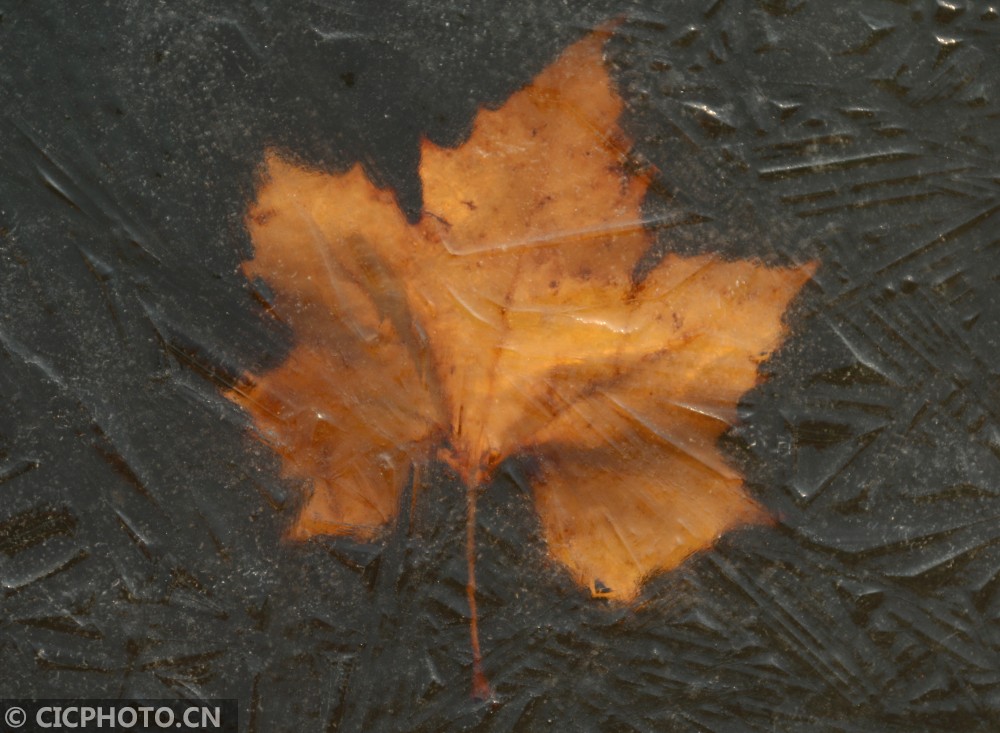 ↑在河北省邢台市广宗县一公园拍摄的冰面下的枫叶。CICPHOTO/祝雪威 摄