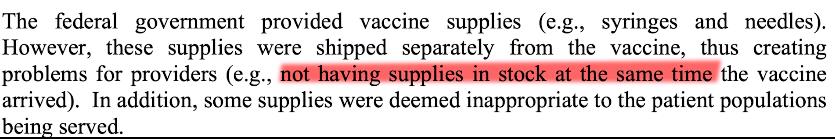 根据一份得州关于甲型流感的总结报告,联邦政府和医疗机构经常沟通不良,导致打疫苗用的针筒、消毒棉签与疫苗不能同时抵达,而且经常断货。