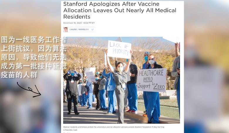 其他州也遇到相似的问题。如新泽西州让人们在社交媒体上预约,纽约州则是使用谷歌的程序让大家注册。加州的斯坦福医学院专门开发了一套算法,结果居家工作的医生因为资历深,年纪大,竟然可以优先于一线医务人员注射疫苗。
