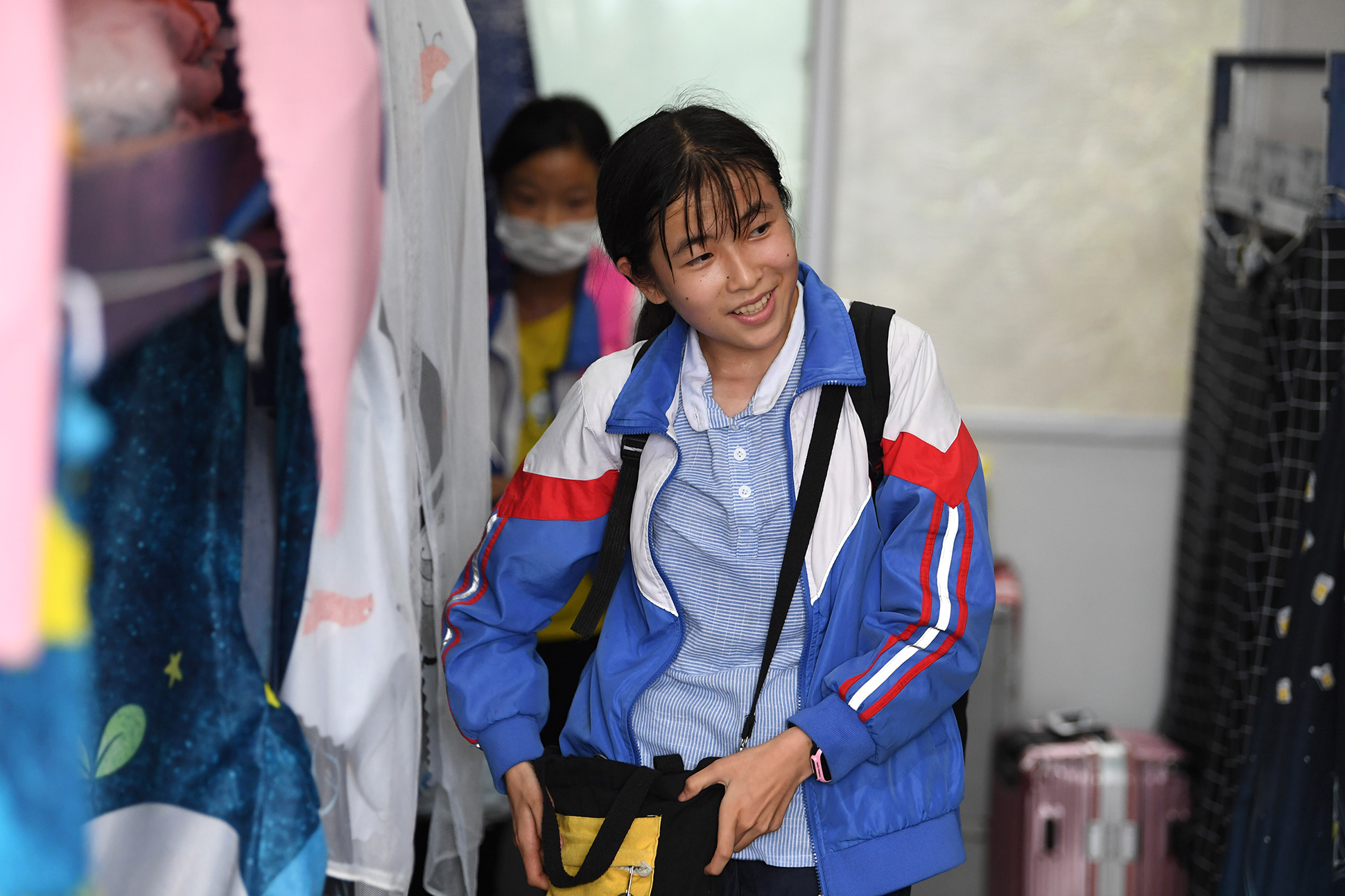 ▲2020年6月19日,在金寨县三合实验学校宿舍,蔡齐艳放学后收拾行李准备回家。