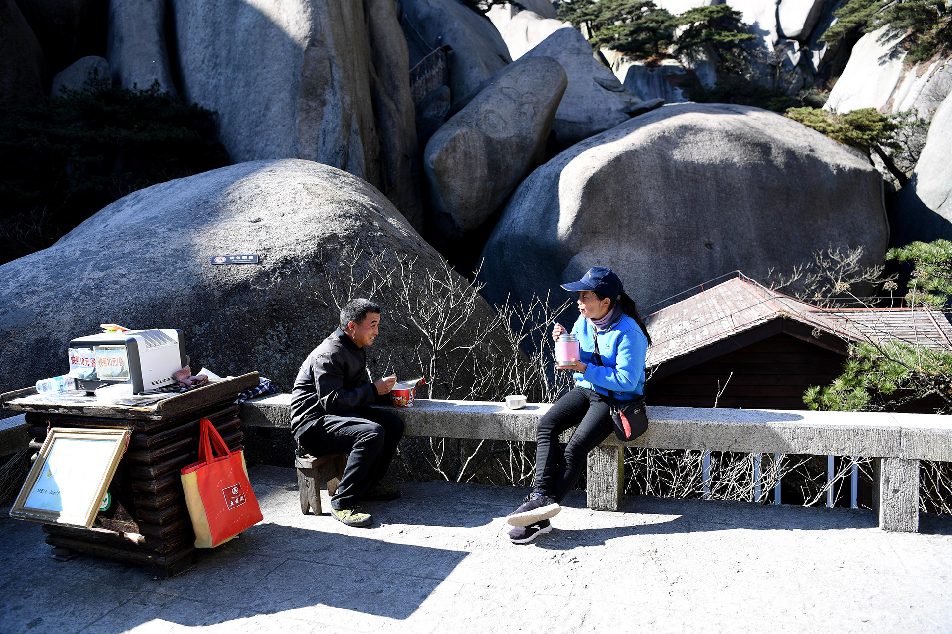 ▲2020年11月13日,徐胜利送货到达天池峰后,返回杨月红工作的平台,与她一起吃午餐。