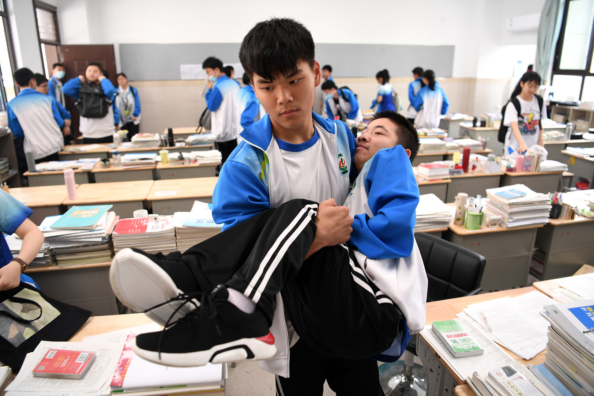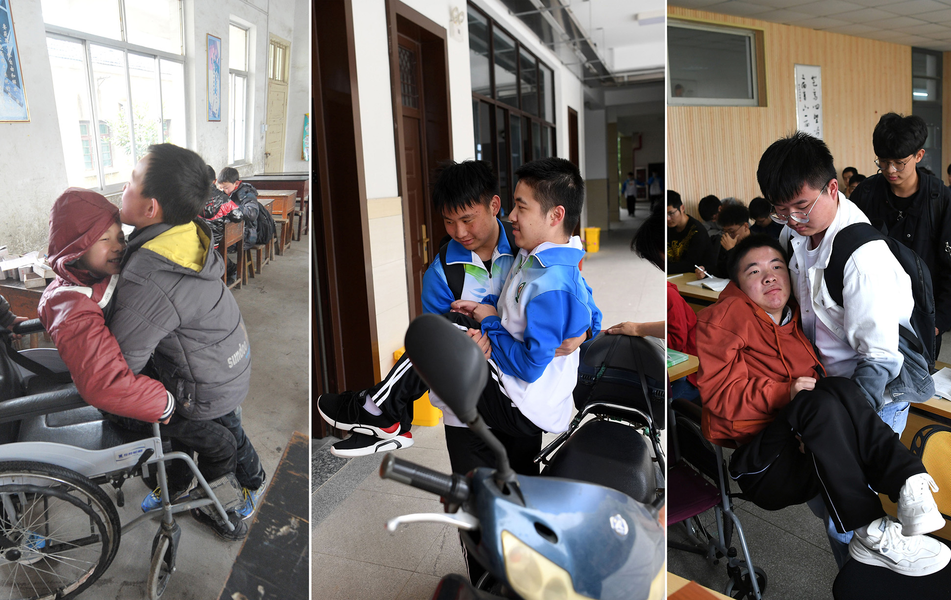 ▲2020年5月28日,广德中学帮扶小组成员涂旻轩把程东东抱起,送到班级门口的电动车上。