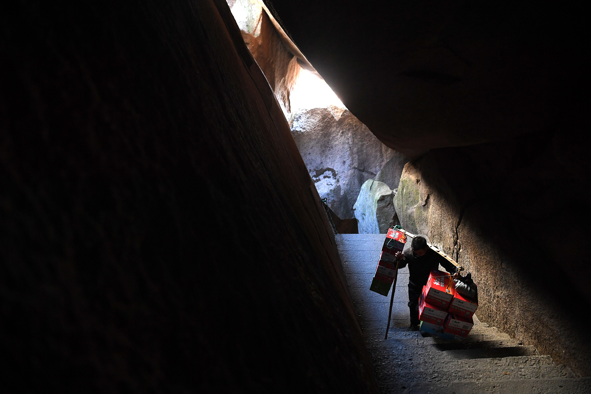 这组报道线索的获得有着偶然性,也有必然性。“挑山”的这个意象在我脑海里存在了很多年。2020年8月份,我在天柱山采访,在半山腰的振衣岗平台,我看到几名挑山工模样的村民在等活,经过询问发现其中就有建档立卡贫困户。经询问,这位挑山工的爱人恰好也在天柱山天池峰工作,为来往的游客拍照留念。