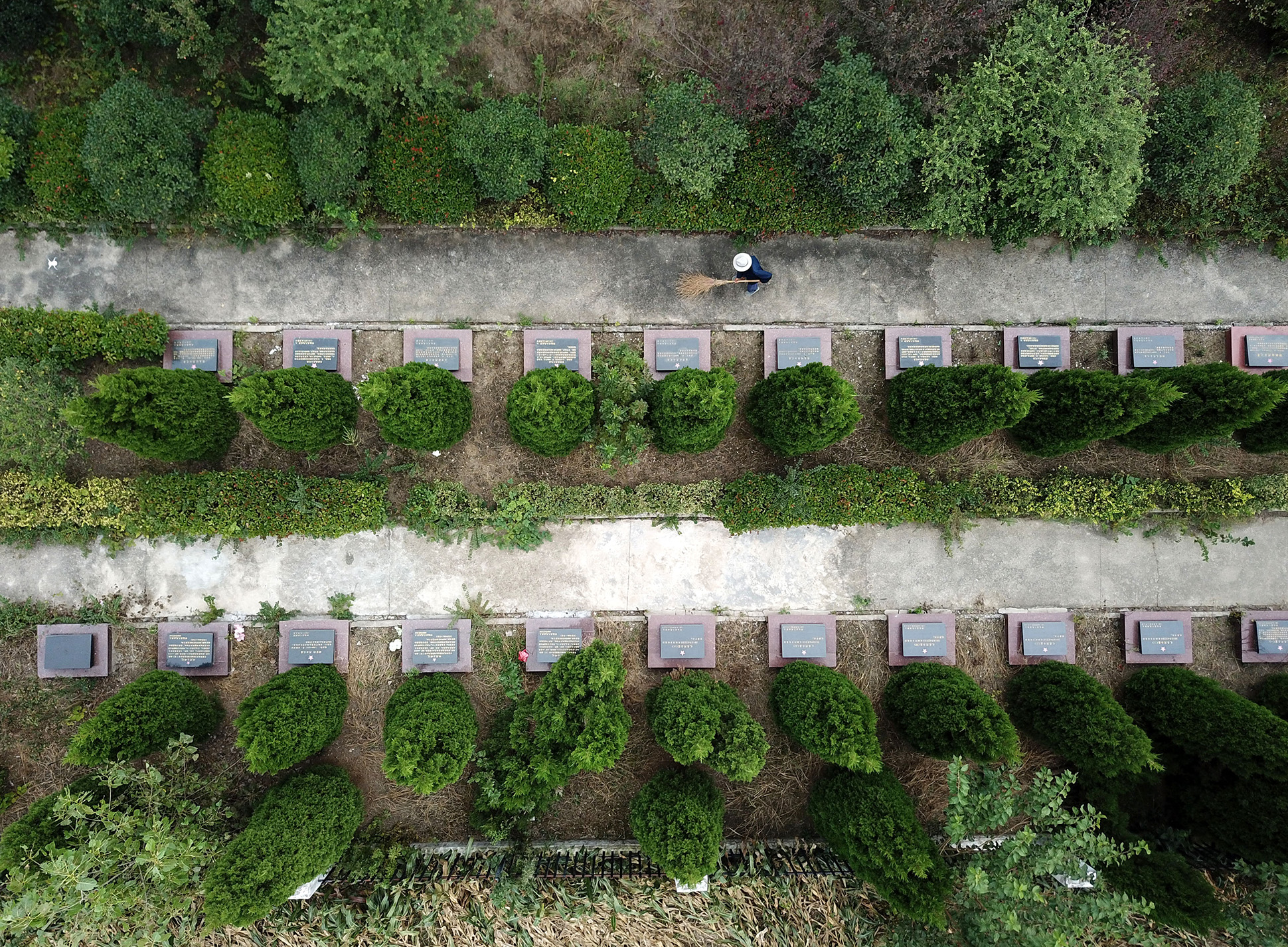 ▲2020年9月15日,胡兆伦在烈士陵园里打扫卫生(无人机照片)。