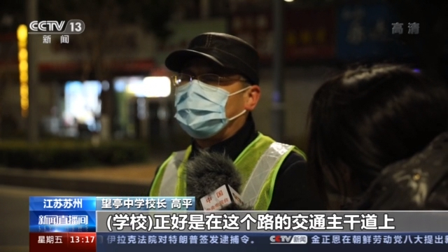 望亭中学校长 高平:学校正好是在这个路的交通主干道上,现在家庭条件都比较好,学生家长都是开车来接送小孩,假如说我们不维护秩序,交通比较堵,尽管说我们镇里面,也有交警到时候来执勤的。但是在前面这一段,是一个真空,学校应该说存在一种安全隐患,那我们就不知不觉把它作为一种分内的事情。