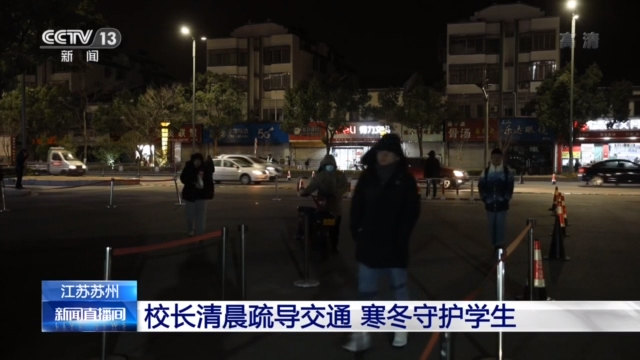 这位正在引导学生过路口的就是校长高平。受近日寒潮影响,清晨5点20分的苏州,温度在零下5摄氏度,高平校长准时出现在望亭中学校门口,查看路面是否有积雪结冰,和同事们铺设隔离锥桶,迎接最早一拨到校自习的高三学生。