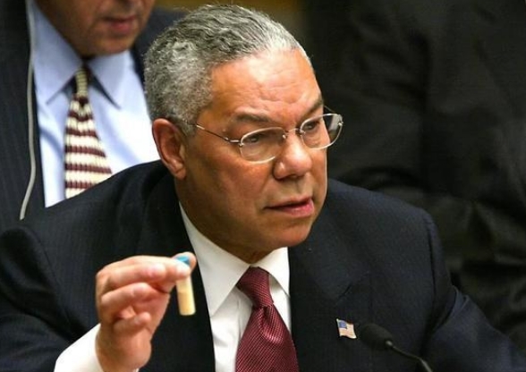 △鲍威尔在2003年2月向联合国安理会发表的讲话中,强烈地提出了美国对伊拉克开战的理由。他在讲话中提供了伊拉克拥有大规模杀伤性武器的“证据”——一小管白色试剂。这一管试剂后来被俄罗斯总统普京讽刺为“洗衣粉”。