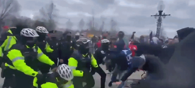 △抗议者与维持秩序的警察发生暴力冲突,抗议者推翻了国会大厦西侧的路障。(图片来源:《华盛顿邮报》)