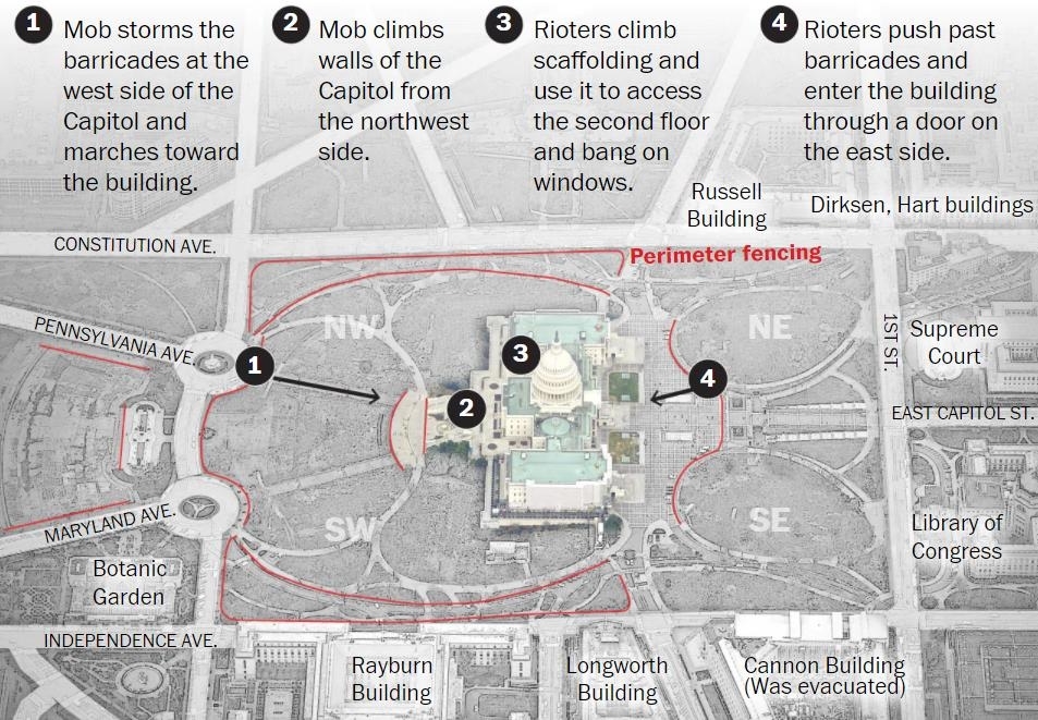 △抗议人群进入国会大厦的路线示意图。(图片来源:《华盛顿邮报》)