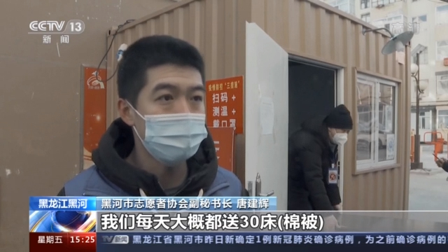 黑河市志愿者协会副秘书长 唐建辉:我们每天大概都送30床(棉被),为像我们身后小区卡口这个活动板房垫上一层棉被,让他们脚底下感觉暖和一些。