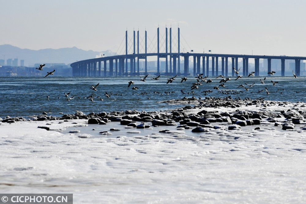 ↑山东省青岛市胶州湾跨海大桥红岛段出现大范围海冰,候鸟在恶劣天气下的冰海间觅食。CICPHOTO/王海滨 摄