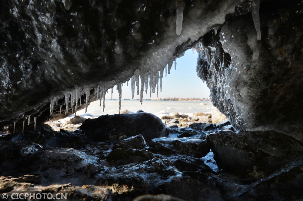 ↑这是在山东省青岛市红岛拍摄的结冰的礁石。CICPHOTO/王海滨 摄
