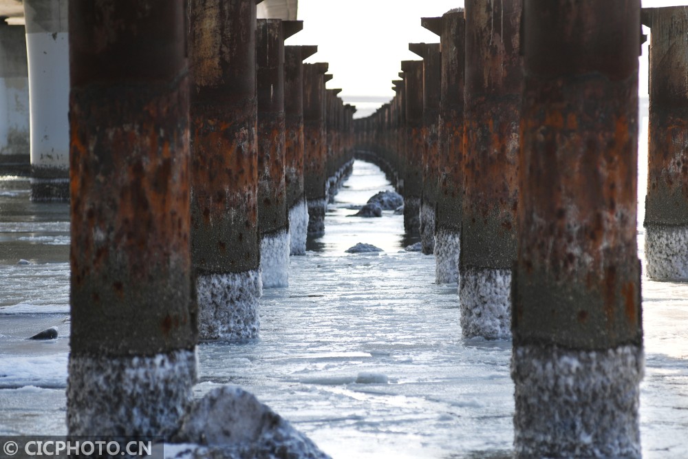 ↑这是在山东省青岛市胶州湾跨海大桥红岛段废弃的桥墩下拍摄的冰海。CICPHOTO/王海滨 摄