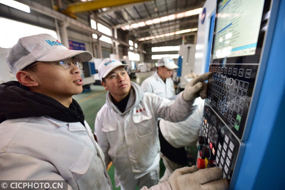 ↑2021年1月7日,在贵州省黔东南苗族侗族自治州丹寨县金钟经济开发区一企业的装配车间,一名学生(左)和工人在查看仪器数据。CICPHOTO/杨武魁 摄