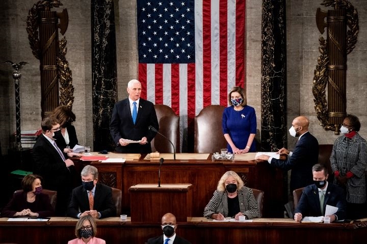 1月6日,在美国华盛顿国会大厦,美国副总统彭斯(后排中左)和国会众议院议长佩洛西(后排中右)出席国会联席会议。美国东部时间7日凌晨,历时近15个小时的美国国会联席会议在经历示威者暴力冲击国会大厦的波折后结束。会议确认,拜登赢得306张选举人票,特朗普获得232张选举人票,拜登当选下一任美国总统。新华社发(Pool图片,埃林·沙夫摄)