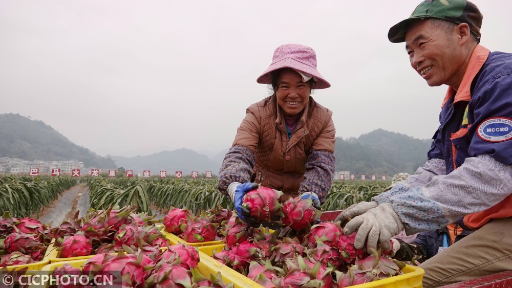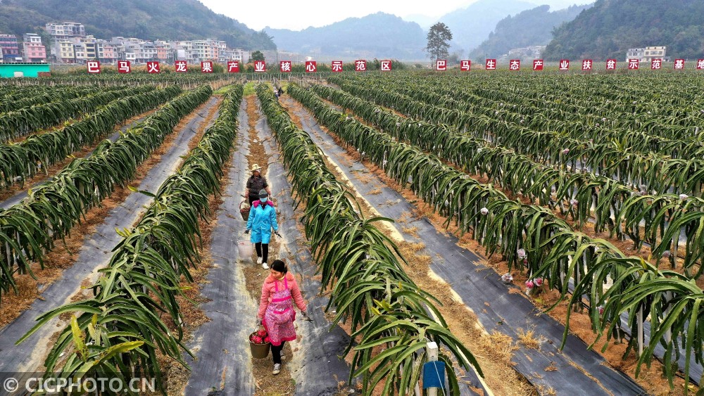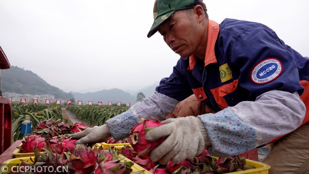 初冬时节,广西巴马瑶族自治县燕洞镇火龙果种植基地,成熟的火龙果挂满枝头,果农们紧张而忙碌的采摘、分拣和装车。巴马瑶族自治县燕洞镇火龙果种植基地2016年开始种植火龙果,目前已经带动基地周边8个贫困村、1378户农户以土地流转、参与务工、集资入股的方式参与示范区建设,推动了村集体经济的发展,带动150户贫困户实现脱贫增收。