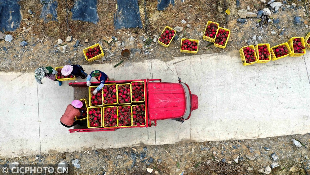 ↑2021年1月6日,在广西巴马瑶族自治县火龙果产业核心示范区,果农装车外运火龙果。CICPHOTO/高东风 摄