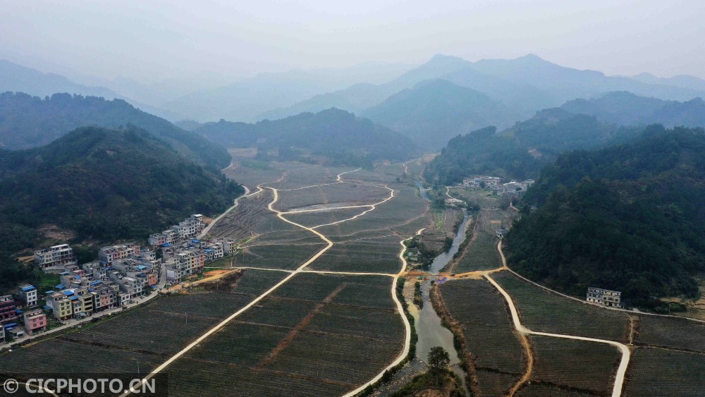↑2021年1月6日,空中俯瞰广西巴马瑶族自治县果农在火龙果产业核心示范区。CICPHOTO/高东风 摄