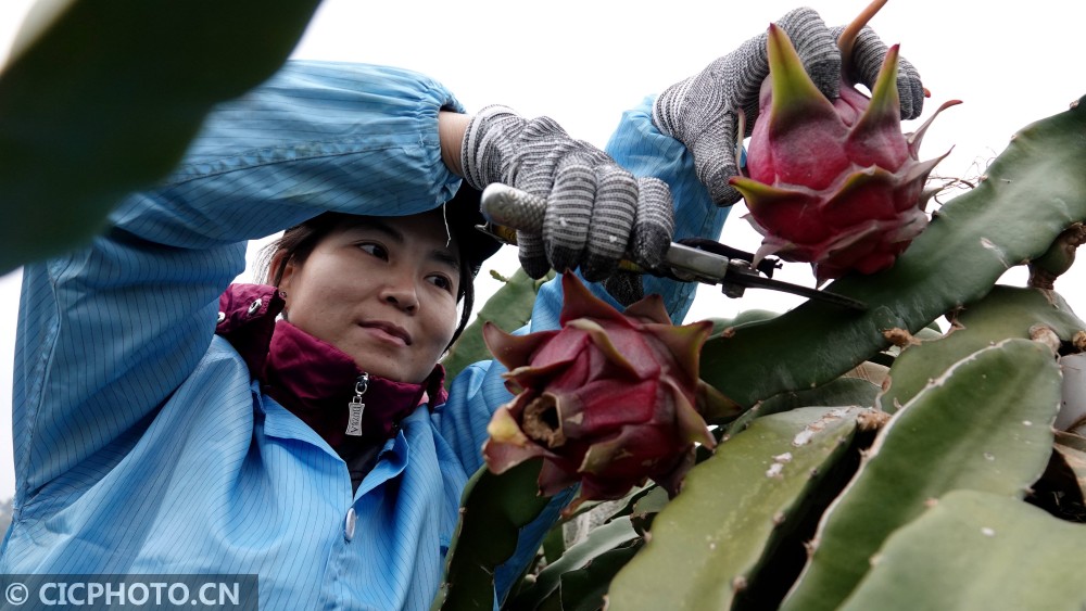 ↑2021年1月6日,在广西巴马瑶族自治县火龙果产业核心示范区,果农采摘成熟的火龙果。CICPHOTO/高东风 摄