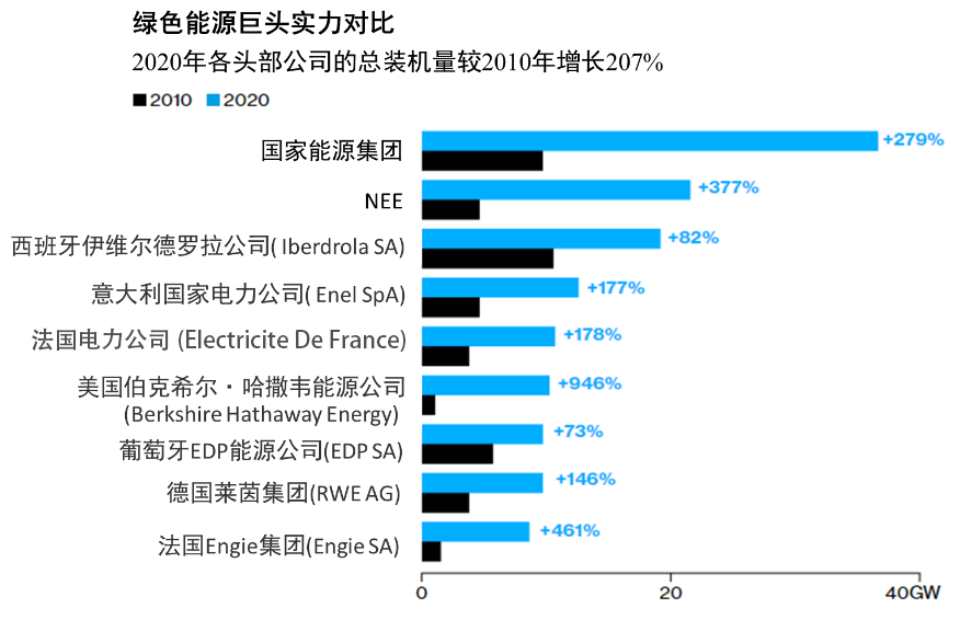 ▲图表:全球绿色能源巨头装机量变化。数据来源:BloombergNEF。