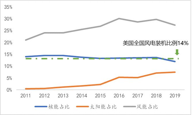 [1] 美国的风电容量占比是全世界最高的,2018年为44%,同时期的中国只有29%。
