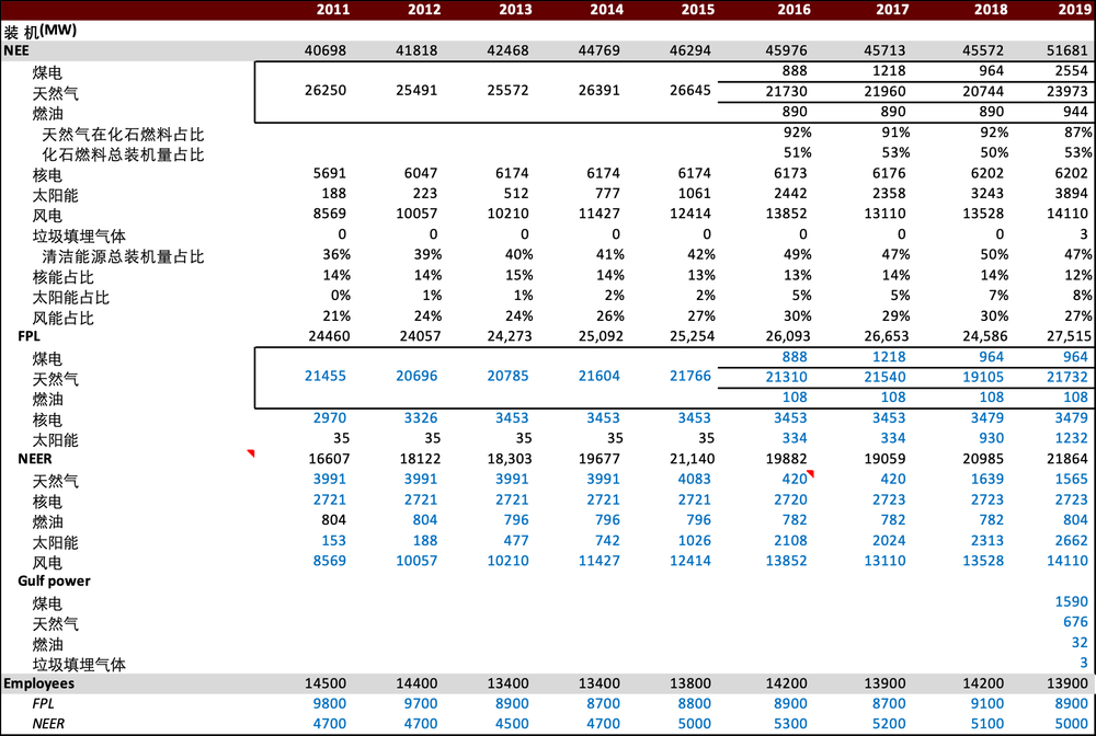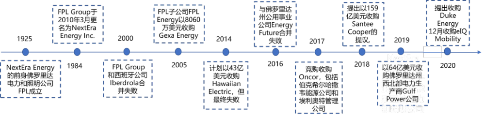 NEE公司前身是成立于1925年的佛罗里达电力和照明公司(Florida Power and Light Company, FPL),控股公司FPLGroup Inc.是在公司开始努力使其业务多元化之后于1984年成立的。2010年3月控股公司FPLGroup Inc.更名为NextEra Energy Inc.(NYSE:NEE)继续加大对可再生能源项目的投入,进一步呼应能源变革时代来临。NEE以及其前身FPL集团对可再生能源的重视由来已久,1989年就部署了第一台风机,1997年成立了专注于清洁能源的子公司NEER(NextEraEnergy Resources),从2009年开始,NEE连续十一年都是北美最大的可再生能源发电公司,是行业的领导者。NEE经营各类发电事业,包括风力发电、太阳能、水利、核能及天然气销售,旗下的天然气销售公司是全美前十大电力供应商之一,公司开发、建设、经营发电厂并提供电力输送服务。除了NEE集团公司在纽交所公开挂牌交易外,子公司NextEra EnergyPartners(NYSE:NEP),也同时在纽交所上市,从事新能源和增量配网的资本运作和并购投资。截至2019年12月31日,该集团公司拥有约14,800名员工。