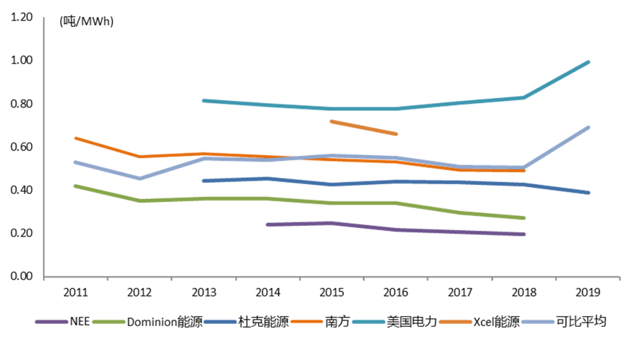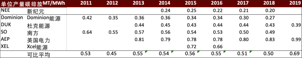 ▲图表: NEE与美国电力公司单位产量碳排率对比及变化趋势。数据来源:Bloomberg