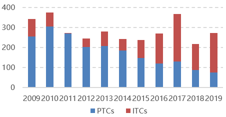 美国政府针对太阳能和风能分别发布了投资税收抵免(ITC)和生产税收抵免(PTC)。ITC由联邦政府提出,2006年正式生效。其主要内容是鼓励纳税人投资再生能源发电设备的奖励性措施,其中提供给太阳能、燃料电池、小型风力发电设备的比例为30%,给地热、小型燃气涡轮发电机以及汽电共生设备的减免比例为10%。PTC是在1992年制定,并进行了长期的政策调整,旨在推动美国风电、太阳能等可再生能源发展,其主要内容是只要采用太阳能等符合资规定的再生能源,每使用一度电就可以获得0.022美元的税赋抵免。2020年6月美国可再生能源和能效法案通过,明确太阳能投资税收抵免(ITC)将以30%的额度延长至2025年,以26%的额度延长至2026年,以22%的额度延长至2027年,随后抵免额度将稳定在10%。风电生产税收抵免(PTC)将在2019年和2020年维持在目前的水平(抵免额度分别为60%和40%),随后以60%的额度延长至2025年底。预计补贴延长将继续刺激美国可再生能源的发展,提升能源效率,同时利于释放美国风电、太阳能产业在经济和环境方面的全部潜力。从近十年公司获得的税收抵免来看,2013年以前公司税收抵免以PTC为主,占比超80%,主要是由于早期公司风电装机迅速发展,但随PTC退坡和太阳能装机量的提升,到2016年公司获得的PTC税收抵免超过ITC,光伏的税收抵免逐渐成为主要的税收抵免来源。2019年公司共获得274亿美元的税收抵免,其中ITC为199亿美元,占比73%,PTC为75亿美元,占比27%。2020年美国宣布将ITC和PTC税收抵免延长5年,为未来五年内部署清洁能源提供一个稳定有效的政策平台,预计NEE将继续受益。