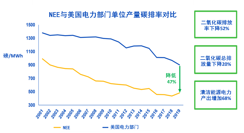 ▲图表:2001-2019年NEE与美国公用事业公司单位MWh发电CO2排放对比。数据来源:NEE September 2020 Investor Presentation,注:(2)下降数据时间段为2005-2019年。