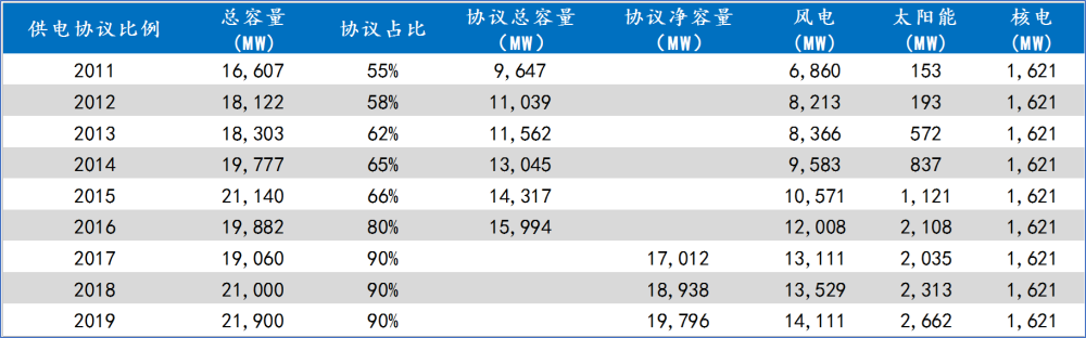 ▲图表:EER 2011-2019年供电协议比例与各类型电源协议容量。数据来源:NEE,东吴证券。