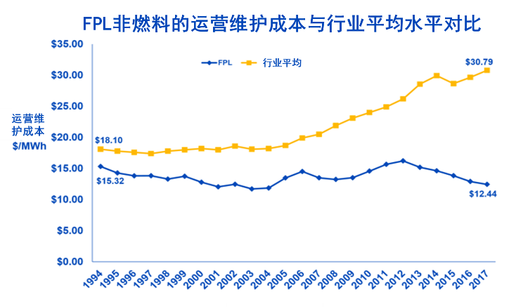 ▲图:FPL非燃料的运营维护成本持续大幅低于同行。数据来源:FPL2018、2019年年报。