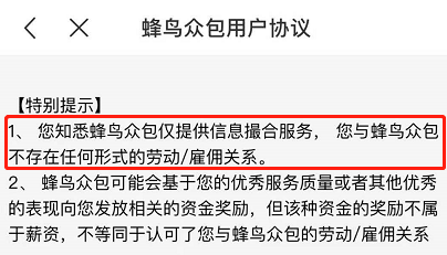 以该外卖平台旗下的骑手送餐平台“蜂鸟众包”为例,注册成为骑手时,用户须选择“已阅读并同意《蜂鸟众包用户协议》”,其中就明确提到:用户与蜂鸟众包不存在任何形式的劳动/雇佣关系。
