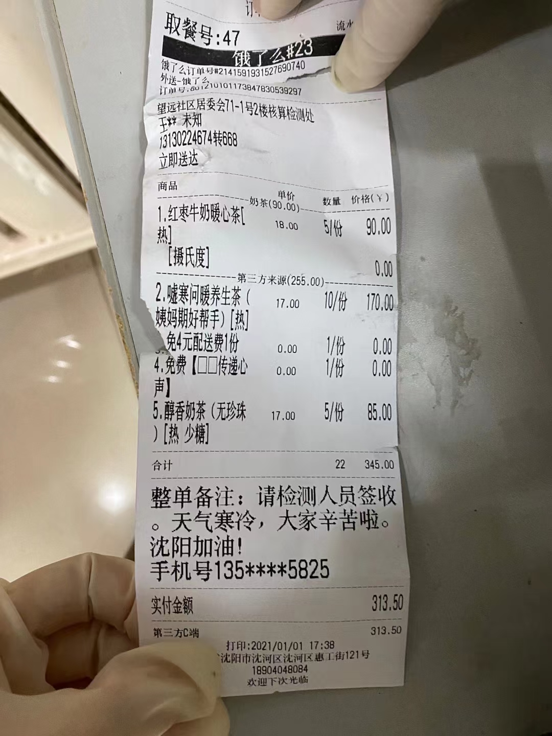 1月1日傍晚,沈阳全员核酸检测第二天,外面冷得手都伸不出来。望远社区核酸检测点内却忙得脚不沾地,医务人员、社区工作者已经连续奋战了十几个小时。突然,几大包热气腾腾的奶茶外卖送来了。
