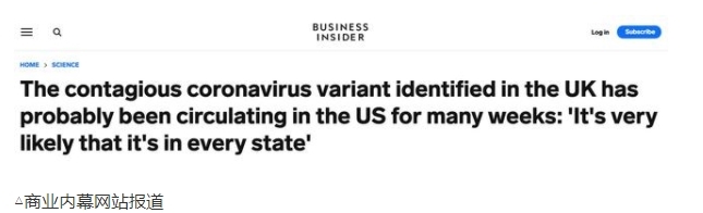 另据美国商业内幕网站近日报道,这种变异病毒可能早在感染病例被发现之前就已经进入了美国,并悄无声息地传播了数周。专家认为,这种变异病毒可能是12月份传入美国的,“很可能每个州都有”。