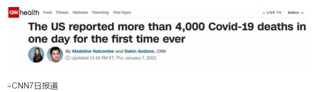 美国有线电视新闻网(CNN)报道称,1月7日,美国新增新冠肺炎死亡病例超过4000例,是自疫情出现以来美国新增死亡病例最多的一天。截至7日,美国新冠肺炎确诊病例已超过2148万例,累计死亡病例超过36.4万例,美国依然是全球疫情最严重的国家。