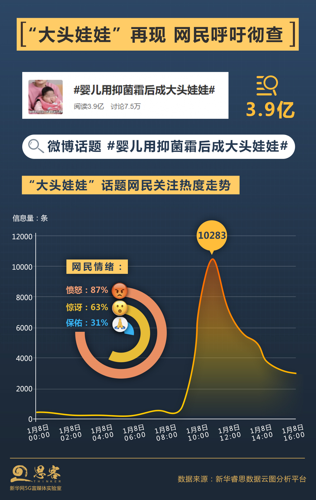 1月7日,网上曝光了一起疑似“大头娃娃”事件。微博博主@老爸测评魏文锋称,有家长购买“嗳婴树”品牌的“益芙灵多效特护抑菌霜”,给5个月大的孩子使用后出现“大头娃娃”现象,发育迟缓、多毛、脸肿大。