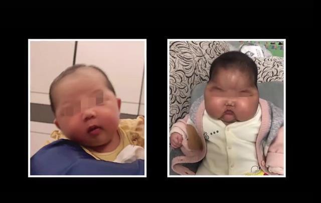 ▲一名5个月大的孩子疑似因使用激素婴儿霜后出现“大头娃娃”现象。图片来源:新浪微博