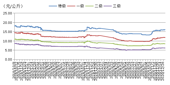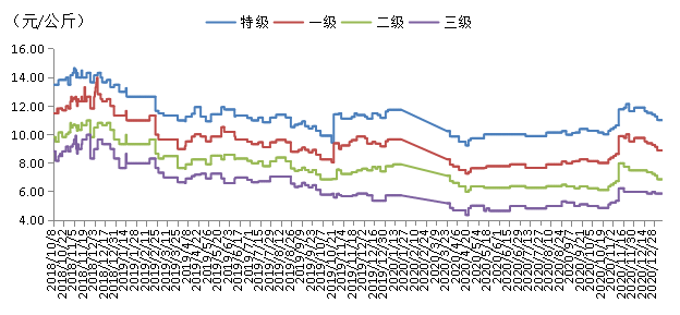 新疆产区方面,截至1月7日,各等级骏枣价格较上周同期持平;各等级灰枣价格涨跌不一,特级灰枣价格本周出现涨势,每公斤出货均价较上周同期上涨0.13元,一级至三级灰枣每公斤出货均价下跌0.05元至0.13元不等。调研显示,因河北市场出货受阻,新疆产区红枣订单在近日有所增多,走货量逐步增大,叠加产区企业红枣销售进入旺季尾声,库存量较少,红枣价格表现坚挺,并呈现出上扬趋势。未来短期,在春节备货对红枣需求的又一利好因素下,新疆产区红枣价格或将小幅上涨。
