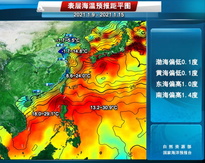 渤海为-1.7℃到5.5℃,比常年偏低0.1℃左右;黄海为-1.4℃到14.8℃,比常年偏低0.1℃左右;东海为8.6℃到24℃,比常年偏高1℃左右;南海为18℃到29.1℃,比常年偏高1.4℃左右;外缘海域为13.2℃到30.9℃,比常年偏高1.2℃左右。(总台央视记者 李洁 郑天皓)