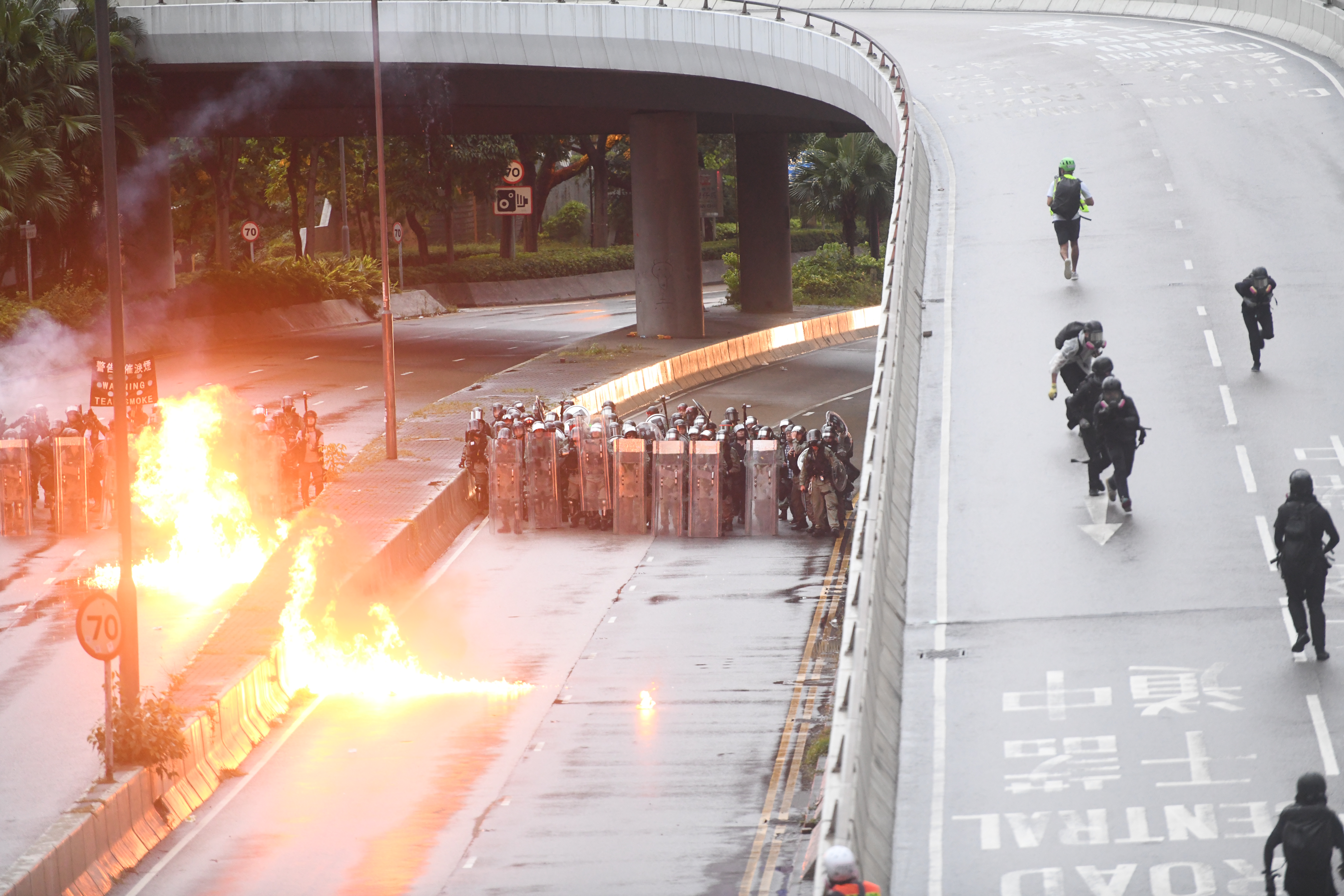在香港金钟,暴徒向警察投掷汽油弹。(2019年8月31日摄)