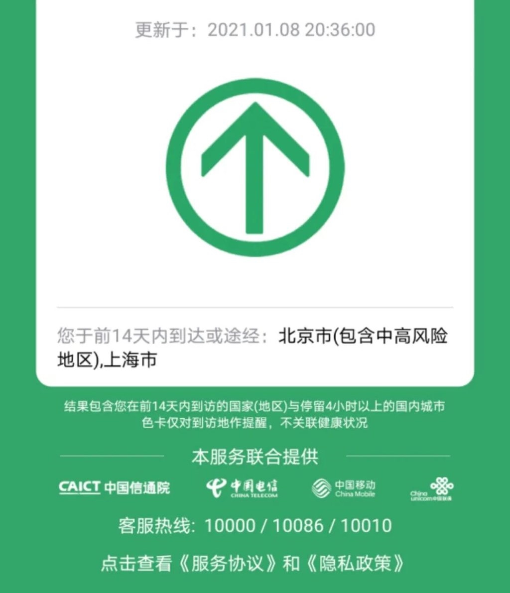 2021年1月8日20时30分起,行程卡将不再对包含中高风险区域的地市名称标记为红色,变更为在城市名称后括号备注包含中高风险区域,备注仅作为出行提示,不关联健康状况,具体管控政策请遵循各地联防联控机制。