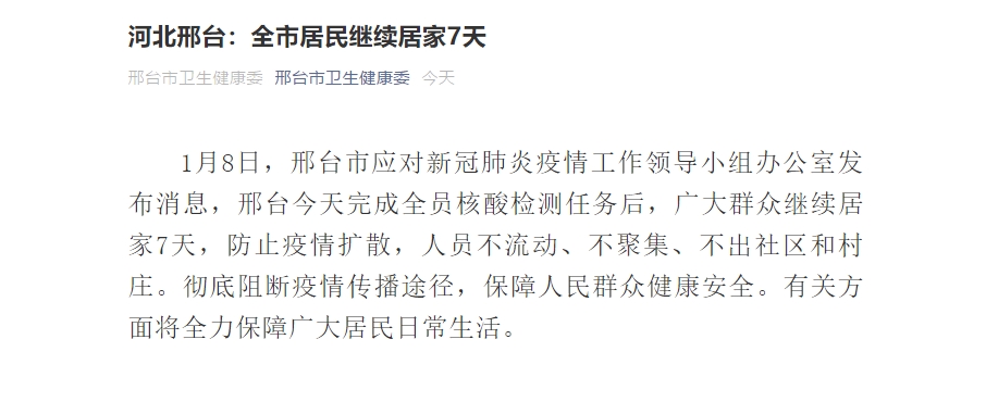 1月8日,邢台市应对新冠肺炎疫情工作领导小组办公室发布消息,邢台8日完成全员核酸检测任务后,广大群众继续居家7天,防止疫情扩散,人员不流动、不聚集、不出社区和村庄。彻底阻断疫情传播途径,保障人民群众健康安全。有关方面将全力保障广大居民日常生活。