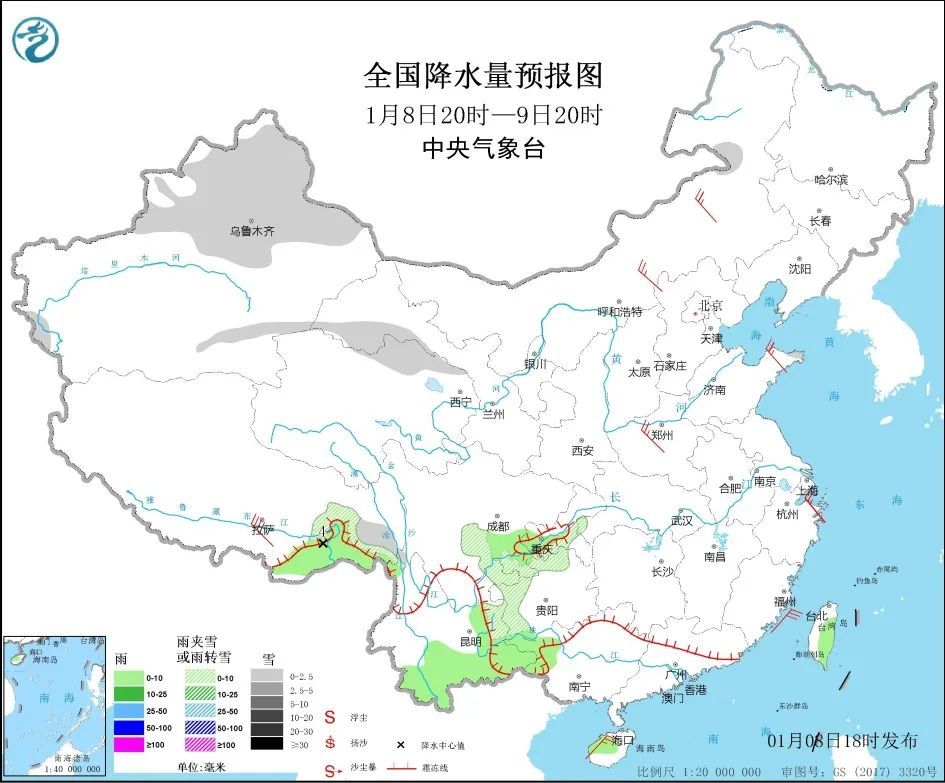 1月8日20时至9日20时,新疆北部、青海北部、甘肃河西、西藏东部、西南地区东部、云南东北部等地部分地区有小雪或雨夹雪。贵州西部、云南东北部局地有冻雨。西藏东南部、四川盆地南部、重庆西南部、云南东部和南部、广西西部、海南岛西部、台湾岛东部等地部分地区有小雨。内蒙古中部、山东半岛、河北北部、河南中部、浙江东部等地部分地区有4~6级风。